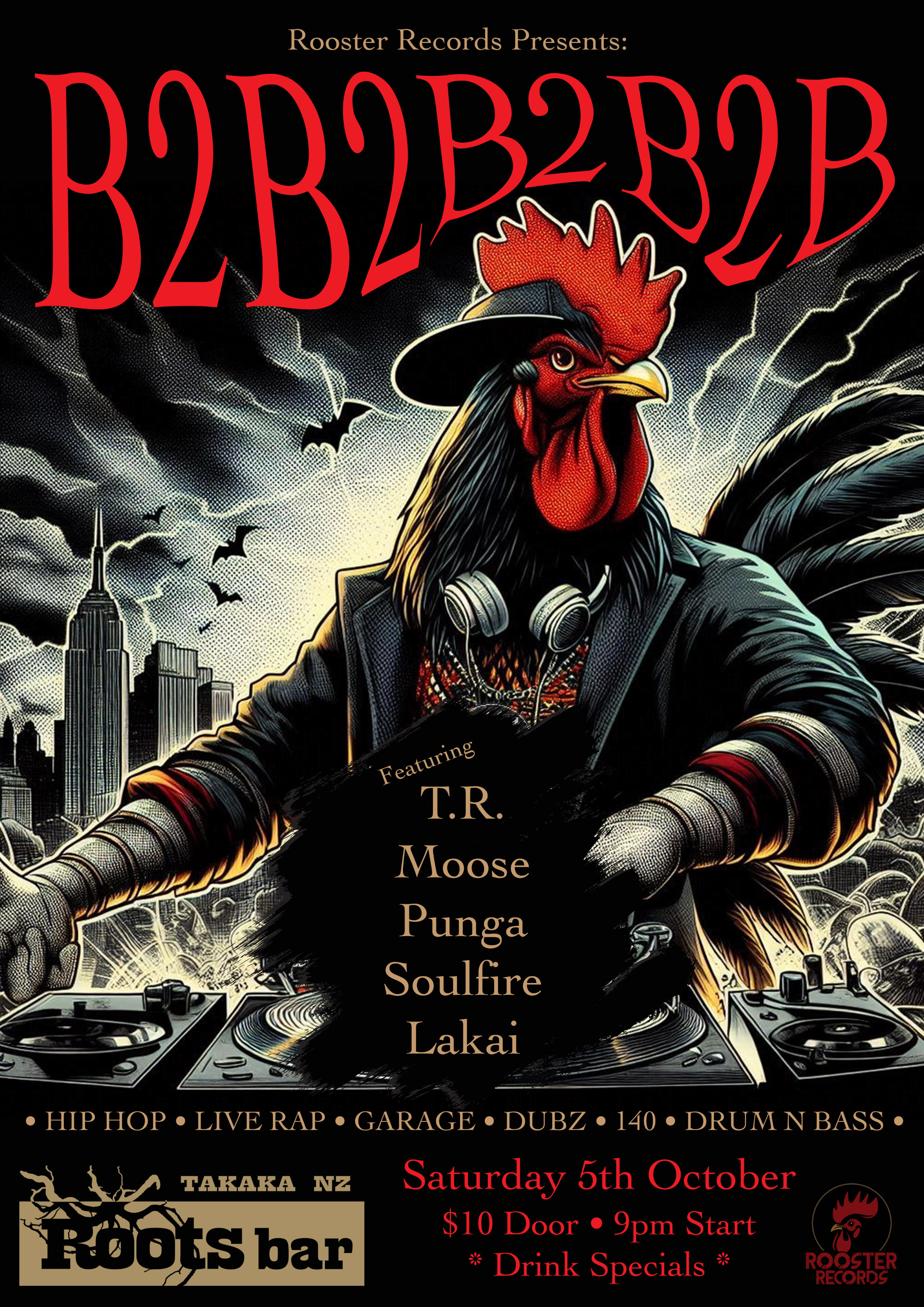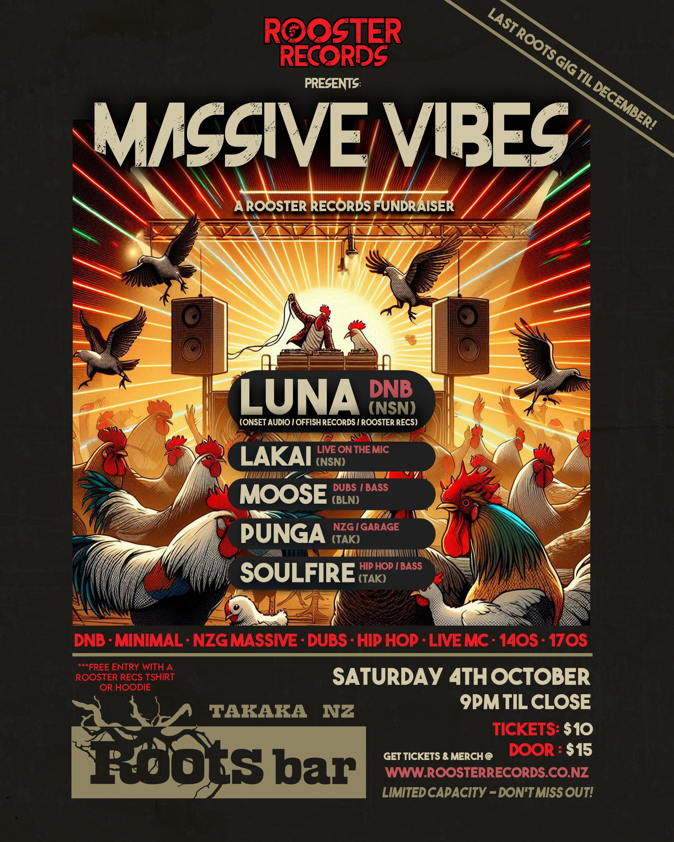 Rooster Records is an independent label born from the underground doof scene of Tākaka and the wider Mohua region, forged in late night recording sessions, questionable sleep schedules, and a shared love for Aotearoa’s sound system culture.